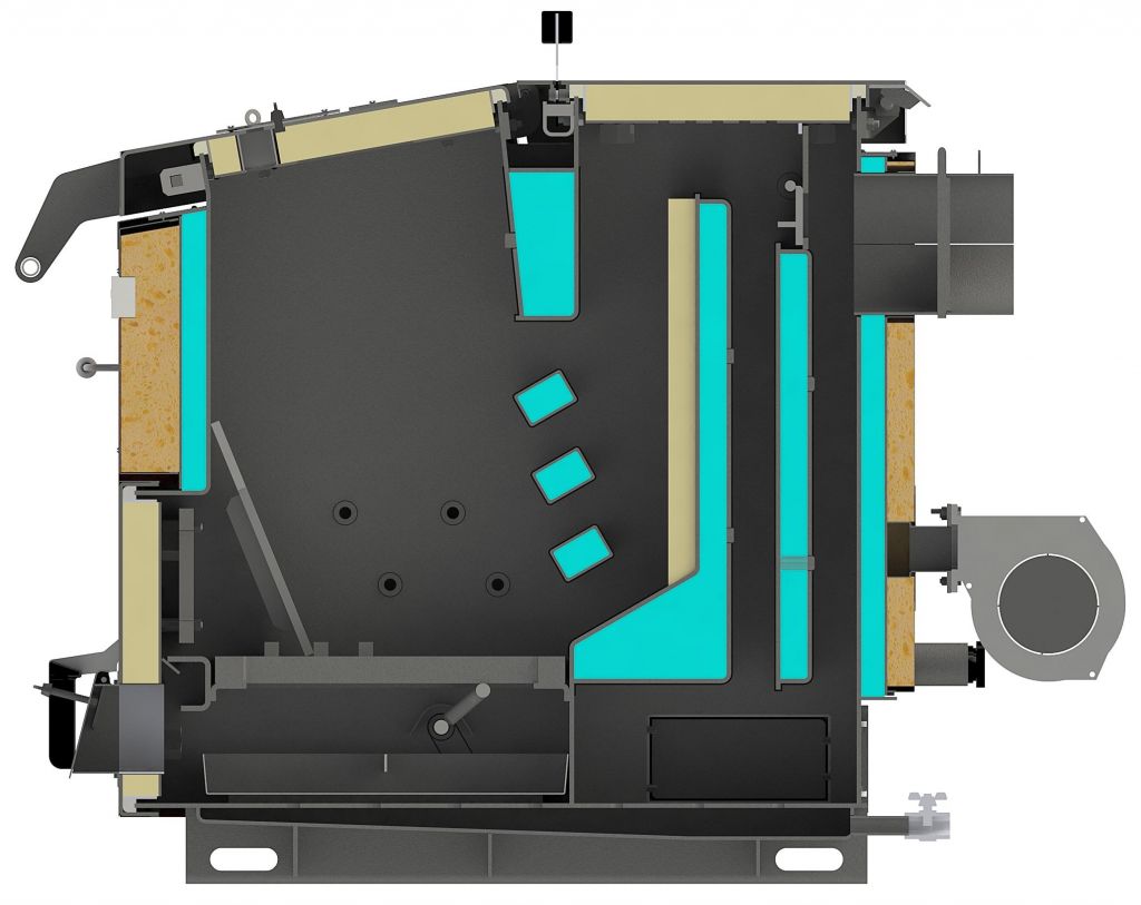 - наявність механічного регулювання тепловою потужністю (шляхом зміни площі колосникової решітки) котла- дає можливість працювати без зменшення ККД котла на менших потужностях (в період міжсезоння і теплих зим) на відміну від котлів без даної опції , в яких ККД в аналогічній ситуації значно зменшується