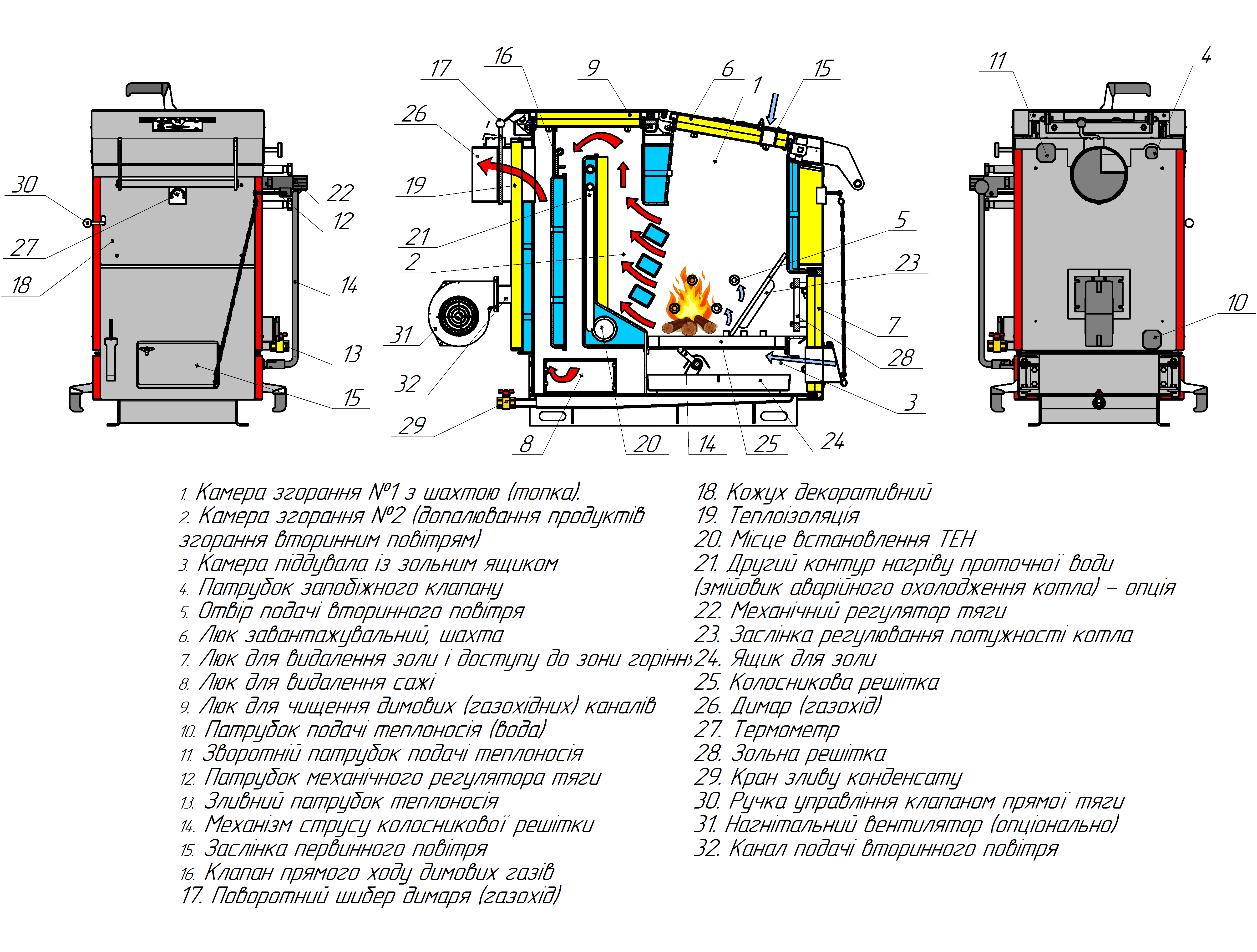 - ручка регулювання клапаном прямої тяги виведена для зручності на передню стінку котла