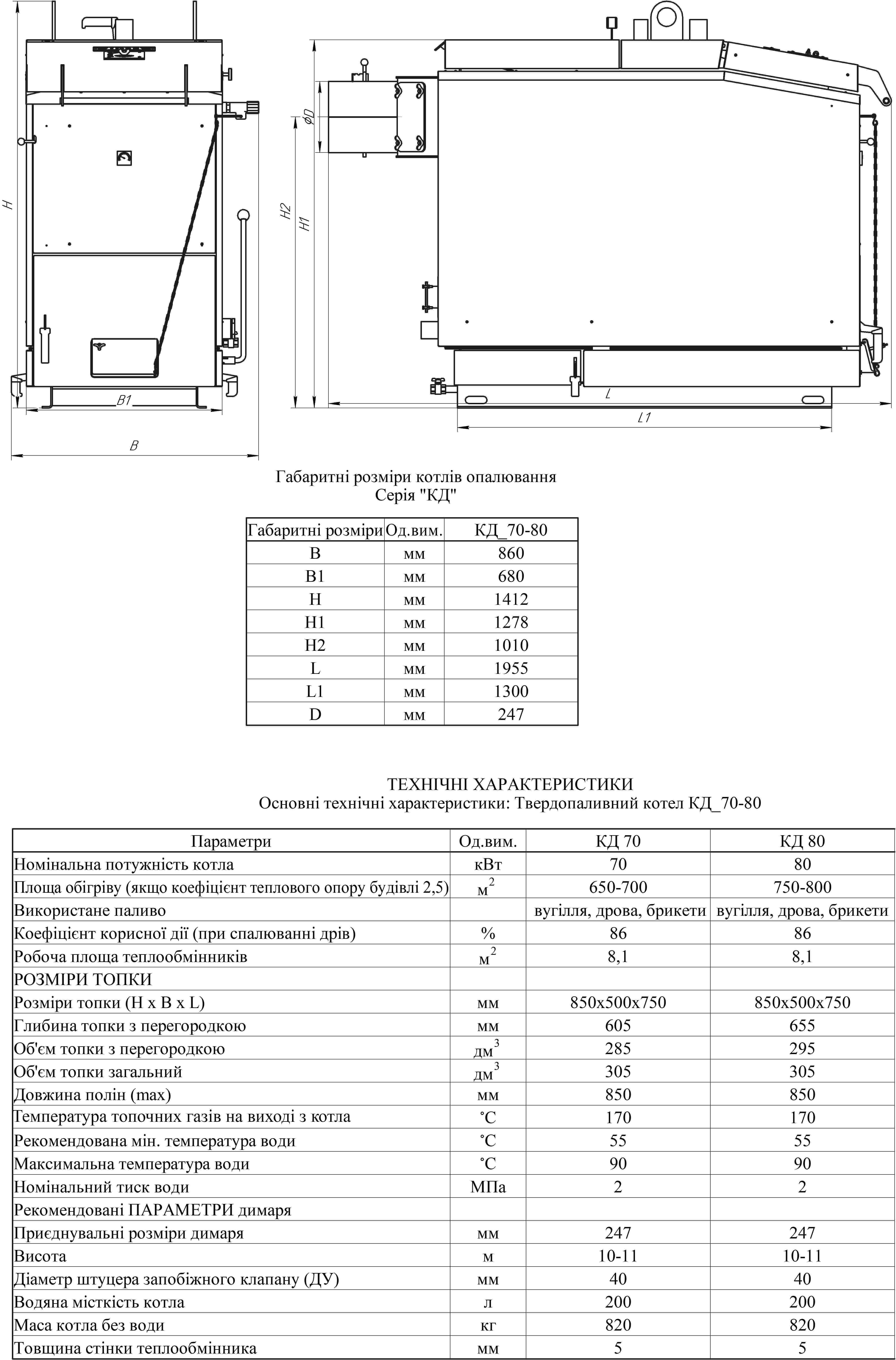 Основні технічні характеристики: Твердопаливний котел КД 70-80 кВт