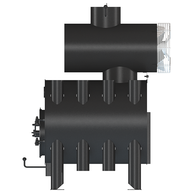 In addition to radiant heat through its own surface and convection heating through the side pipes in the buleryan body, heat is transferred from the surface of the heat exchanger. The directional flow of heated air is due to the axial fan. Thus, the rapid distribution of heated air, uniform heating of the heated room is ensured. The use of a heat exchanger improves the efficiency of the furnace, increases its efficiency due to the additional transfer of heat from flue gases through the surface of the heat exchanger to the heated room and increases the heat output of the furnace. After passing through the heat exchanger, the flue gases are discharged through the chimneys into the environment.