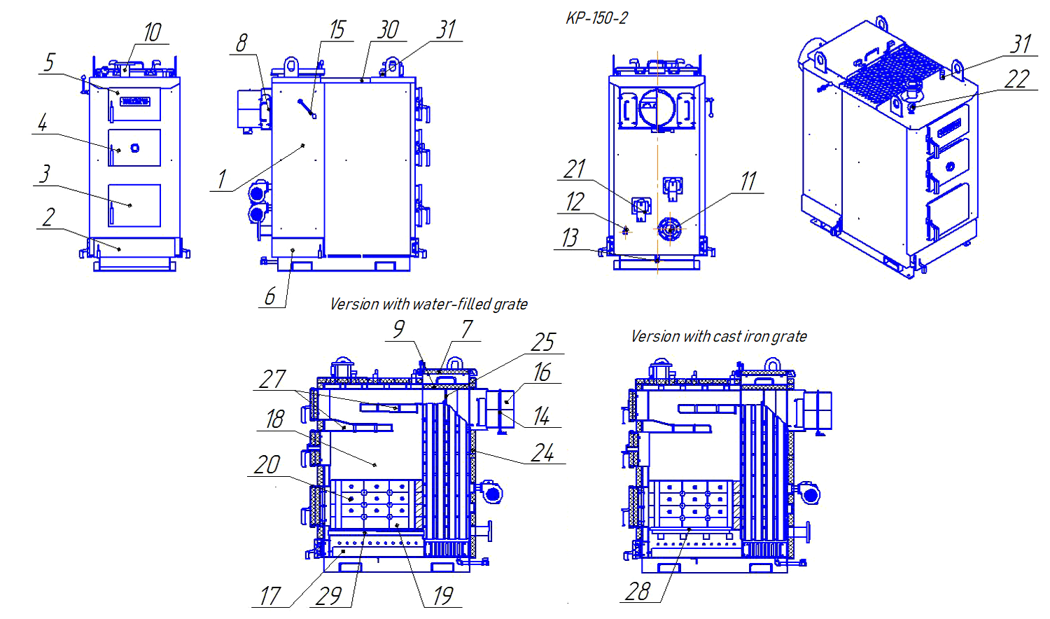 | 14. Thrust regulator | 28. Cast iron grate |