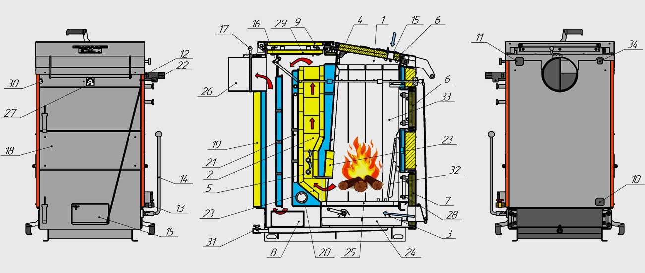 | 9. Hatch for cleaning smoke (gas) channels | 26. Chimney (flue) |